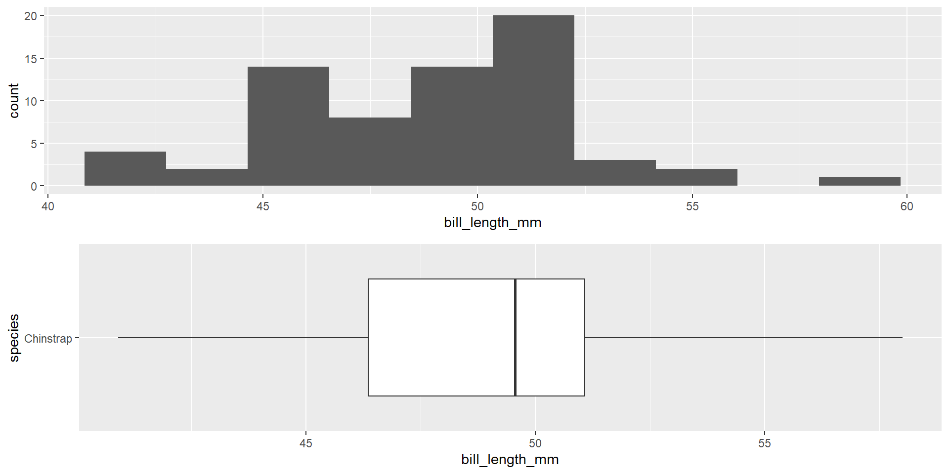 We are going to use a familiar data set (penguins) to demonstrate these theory based procedures. In this example, we are interested in exploring if the species of the penguin impacts the bill length (mm) of the penguin on the Palmer island. We will be looking at the Chinstrap and Gentoo species of penguin. We are interested in researching if there is a difference in bill length between the Gentoo penguins the Chinstrap penguins.