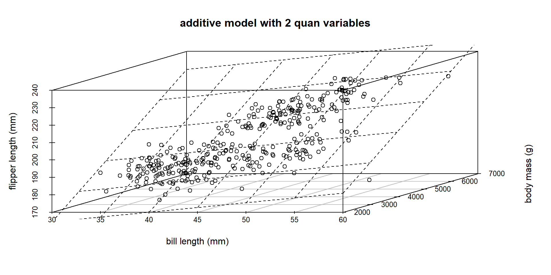 \(\widehat{\text{flipper length}} = 147.563 + 1.10*\text{bill length}\) \(- 5.25*\text{Chinstrap} + 17.55*\text{Gentoo}\)