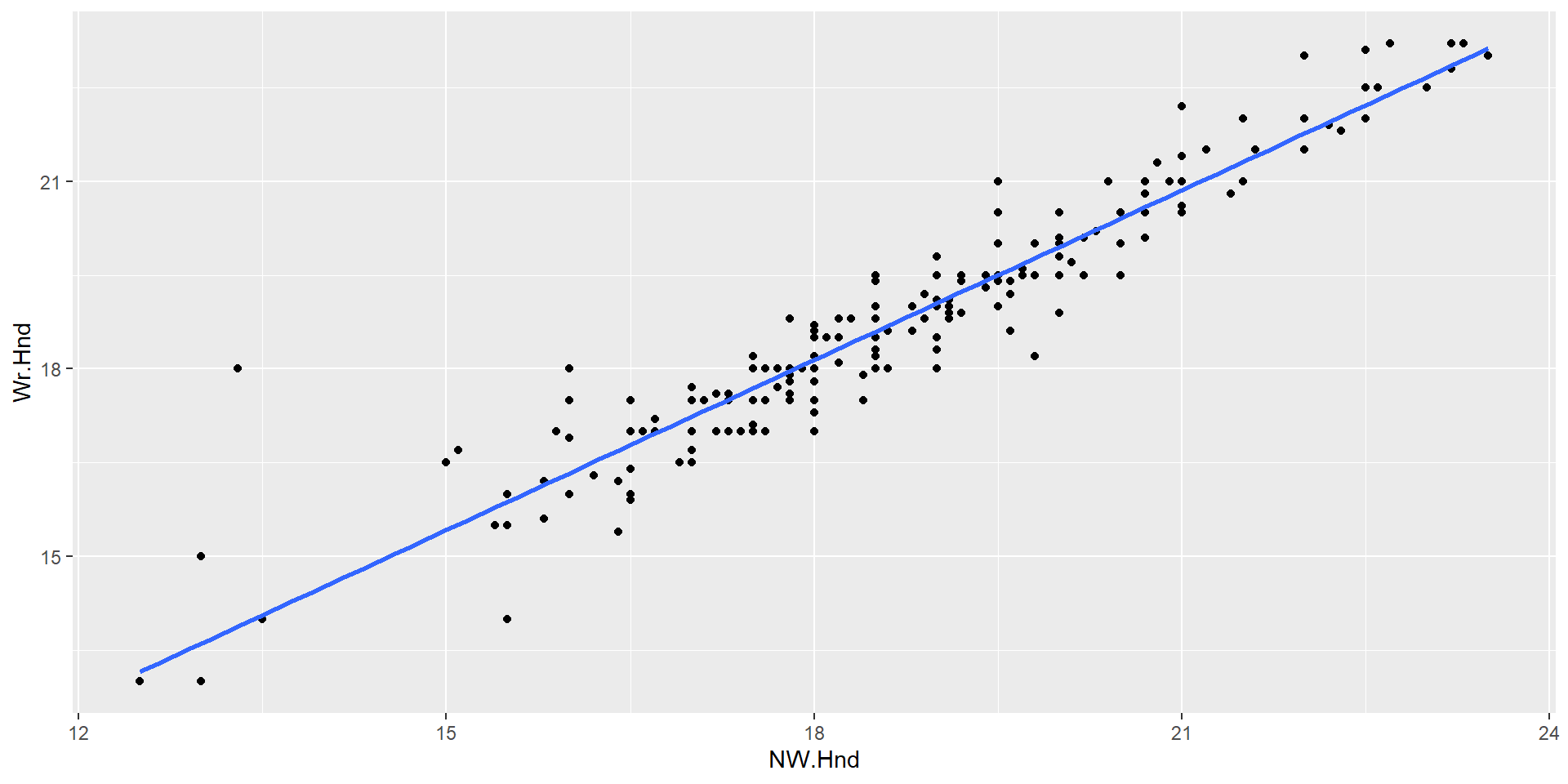 We are interested in comparing the relationship between the span (measured in centimeters) of a student’s writing hand, and the span of their non-writing hand. That is, can we use the span of a student’s non-writing hand to predict the span of their writing hand?