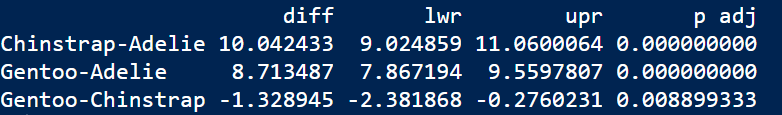 The results from the Anova was to conclude that at least one true mean bill length was different. What do the following results tell us below?