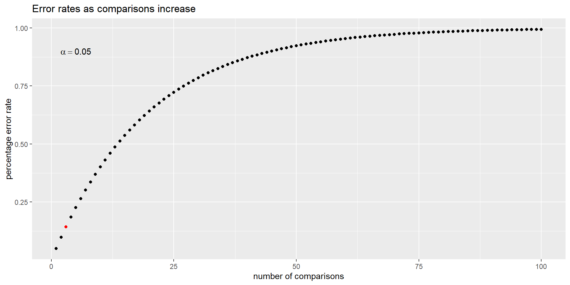 FWER = \(1 - (1-.05)^3 = 0.143\)